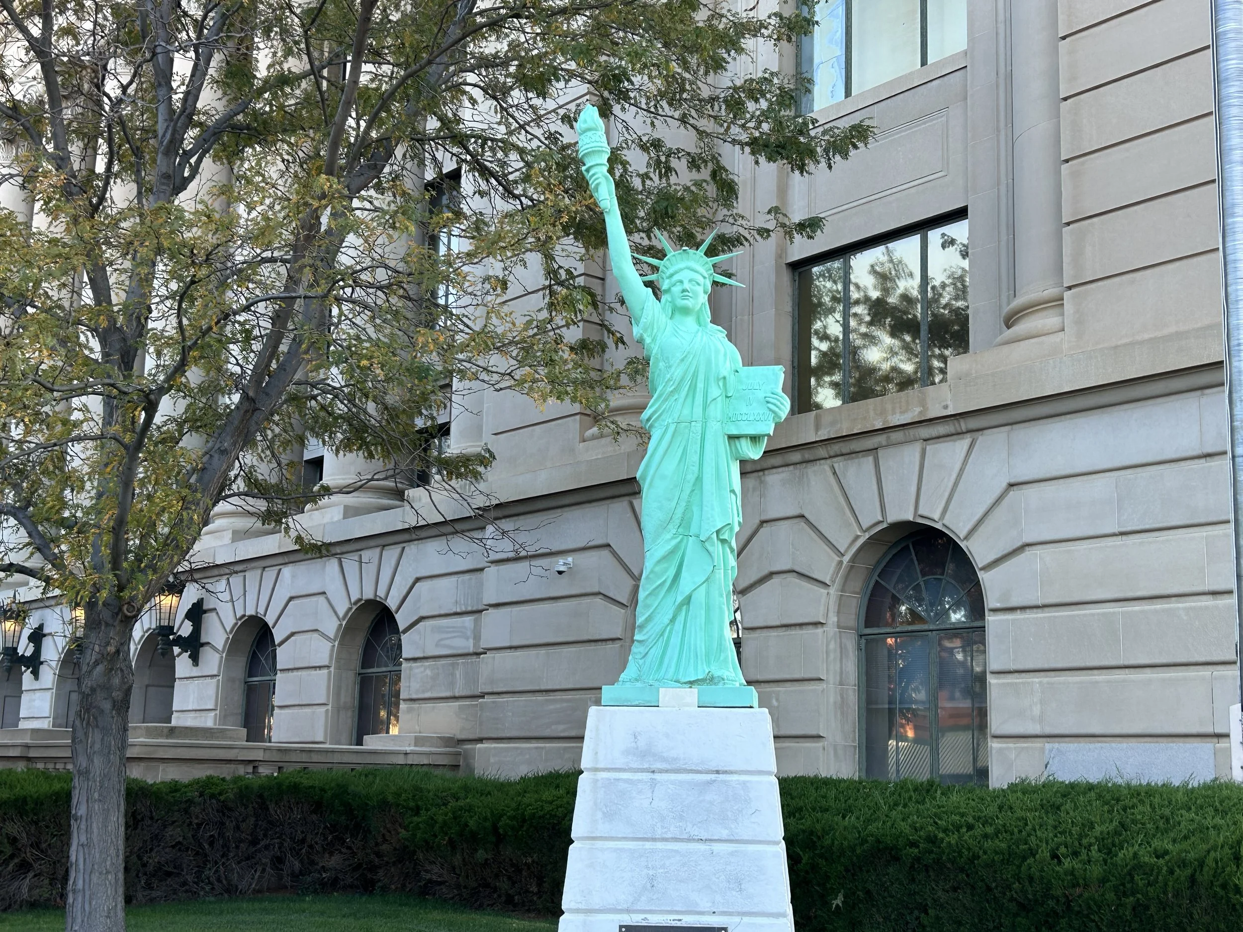 4: Image four is of the tiny replica of the Statue of Liberty outside the courthouse. Liberity is one of the first things people think of when imagining America. The statue is meant to act as a guiding light for people to follow in search of freedom.